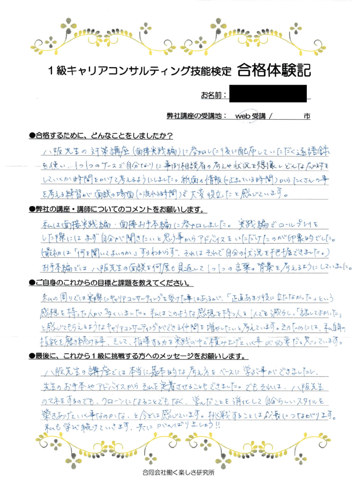 「八阪先生の講座では本当に基本的な考えをベースに学ぶことができましたし、先生のお手本やアドバイスからそれを定着させることもできました。でもそれは、八阪先生のマネをするのでも、クローンになることでもなく、学んだことを消化して自分らしいスタイルを築き上げていくことなのかな、と今では感じています。挑戦することは成長に繋がります。私も学び続けていきます。共に頑張りましょう!!」