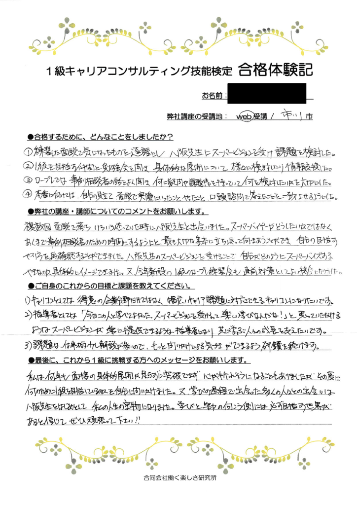 「私は何年も面接の具体的展開が足らずに突破できず、心が折れそうになることもありましたが、その度に何のために1級を目指しているのかを自分に問いかけました。また、学びの過程で出会った多くの人たちとの出会いは、八阪先生をはじめとして私の人生の宝物になりました。学びと努力の向こう側には、必ず目指す世界があると信じてぜひ頑張って下さい!!」
