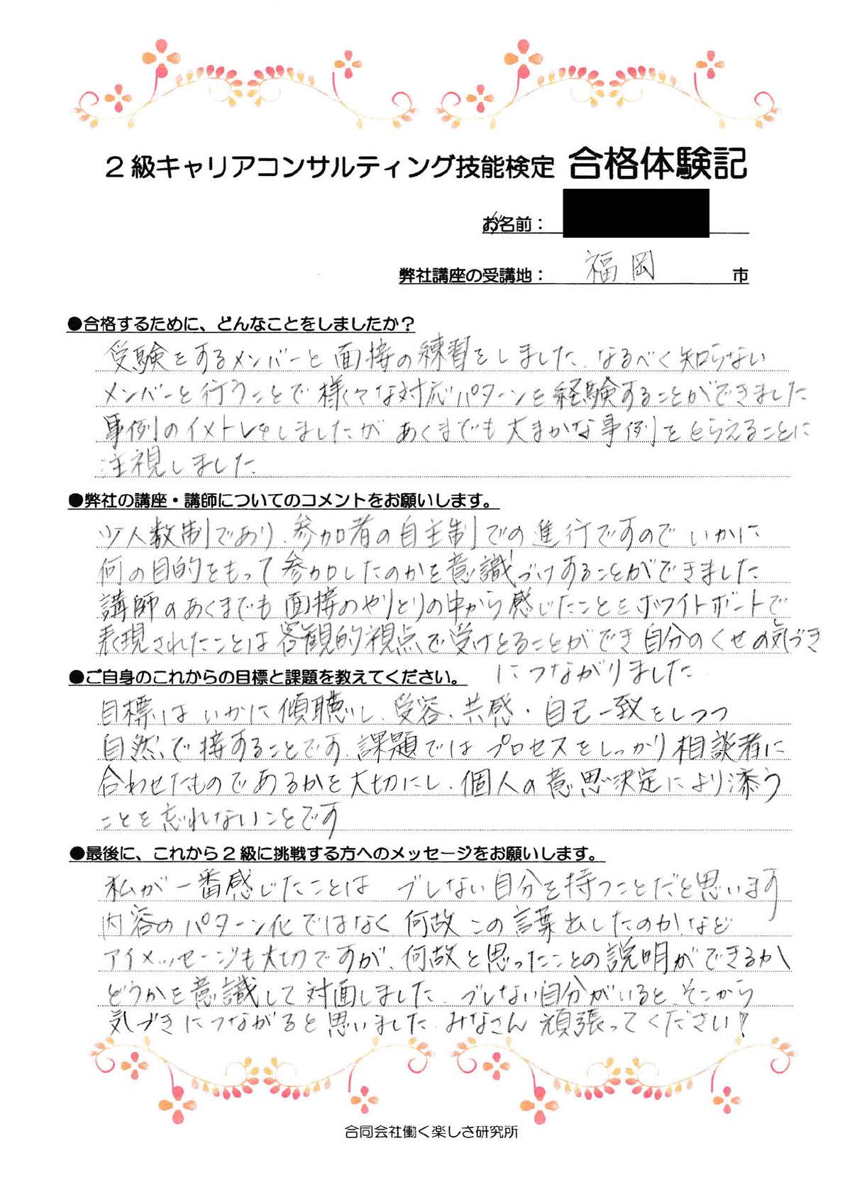 「私が一番感じたことは、ブレない自分を持つことだと思います。内容のパターン化ではなく、何故この言葉を出したのかなど、Iメッセージも大切ですが、何故と思ったことの説明ができるかどうかを意識して対面しました。ブレない自分がいると、そこから気付きに繋がると思いました。みなさん頑張ってください!」