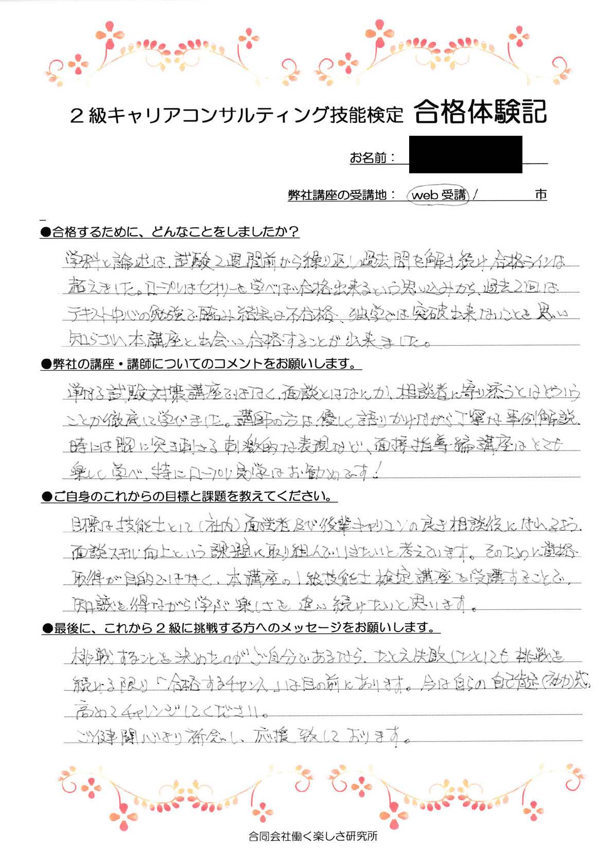 ブログ 2022.09.27 2023.10.27 合格体験記挑戦を続ける限り『合格するチャンス』は目の前にあります。 執筆者 | 合同会社働く楽しさ研究所 大阪府・企業領域・第28回合格 「挑戦すると決めたのがご自分であるなら、たとえ失敗したとしても挑戦を続ける限り『合格するチャンス』は目の前にあります。今は自らの自己肯定感(自己効力感)を高めてチャレンジしてください。ご健闘を心より祈念し、応援いたしております。」 2級CC技能検定対策講座のご案内ページはこちら 一覧へ戻る