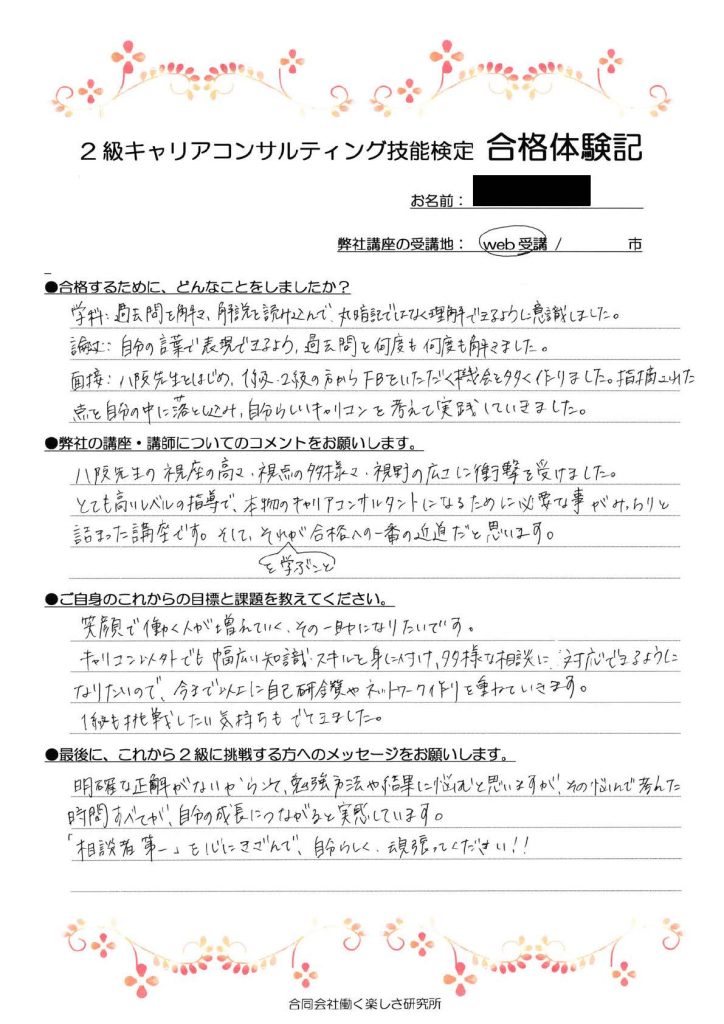 ブログ 2022.10.02 2023.10.27 合格体験記悩んで考えた時間すべてが、自分の成長につながると実感しています。執筆者 | 合同会社働く楽しさ研究所 福岡県・第28回合格「明確な正解がないからこそ、勉強方法や結果に悩むと思いますが、その悩んで考えた時間すべてが、自分の成長につながると実感しています。『相談者第一』を心に刻んで、自分らしく頑張ってください!!」2級CC技能検定対策講座のご案内ページはこちら一覧へ戻る