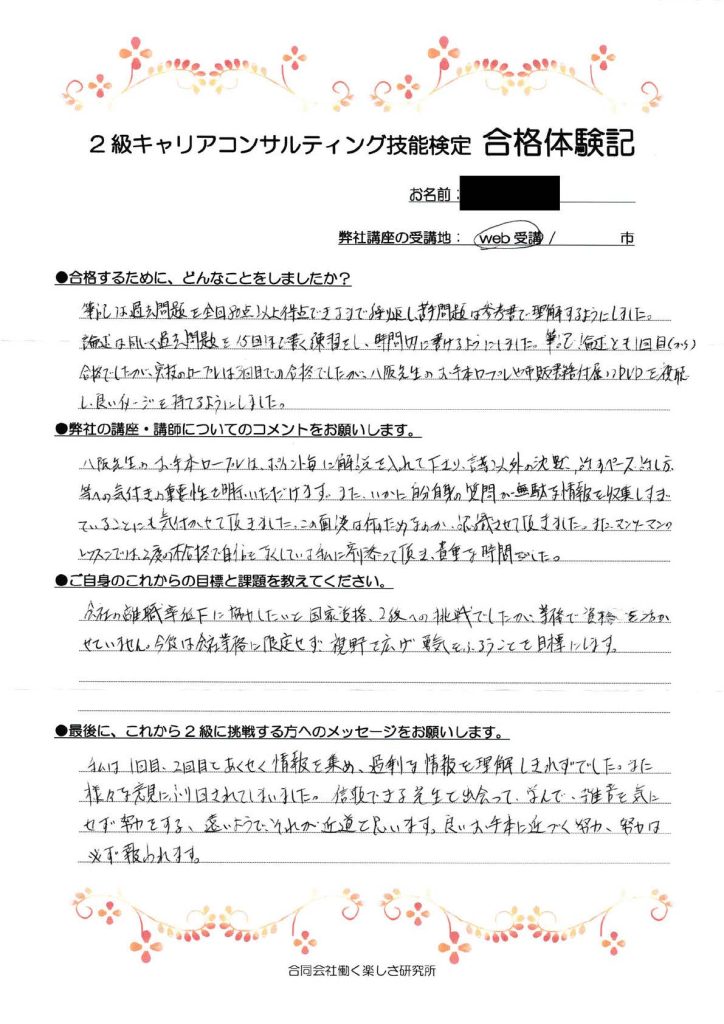 「私は1回目・2回目とあくせく情報を集め、過剰な情報を理解しきれずでした。またさまざまな意見に振り回されていました。信頼できる先生と出会って、学んで、雑音を気にせず努力をする。遠いようで、それが近道と思います。良いお手本に近づく努力、努力は必ず報われます。」