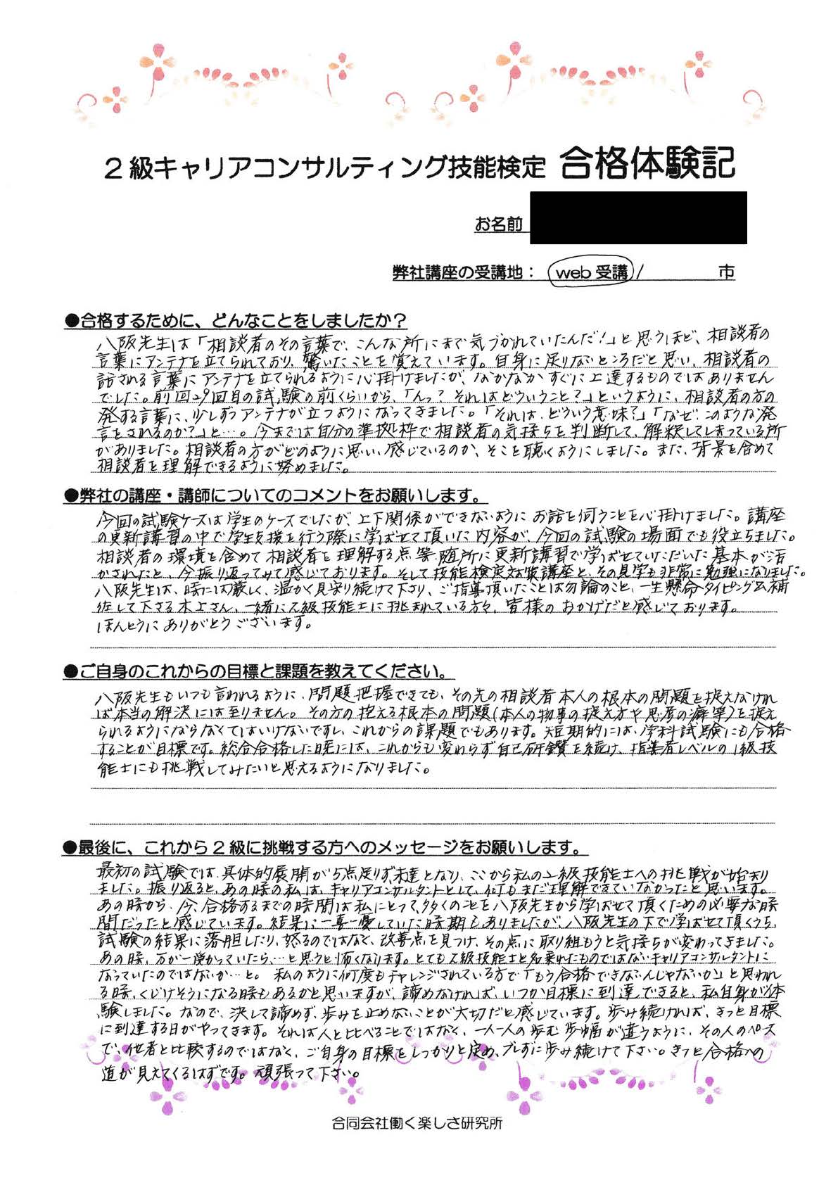 あの時から、今合格するまでの時間は私にとって多くのことを八阪先生から学ばせていただくための必要な時間だったと感じています。結果に一喜一憂していた時期もありましたが、八阪先生のもとで学ばせていただくうち、試験の結果に落胆したり、怒るのではなく、改善点を見つけ、その点に取り組もうと気持ちが変わってきました。あの時万が一受かっていたら…と思うと怖くなります。とても2級CC技能士と名乗れたものではないキャリアコンサルタントになっていたのではないか…と。