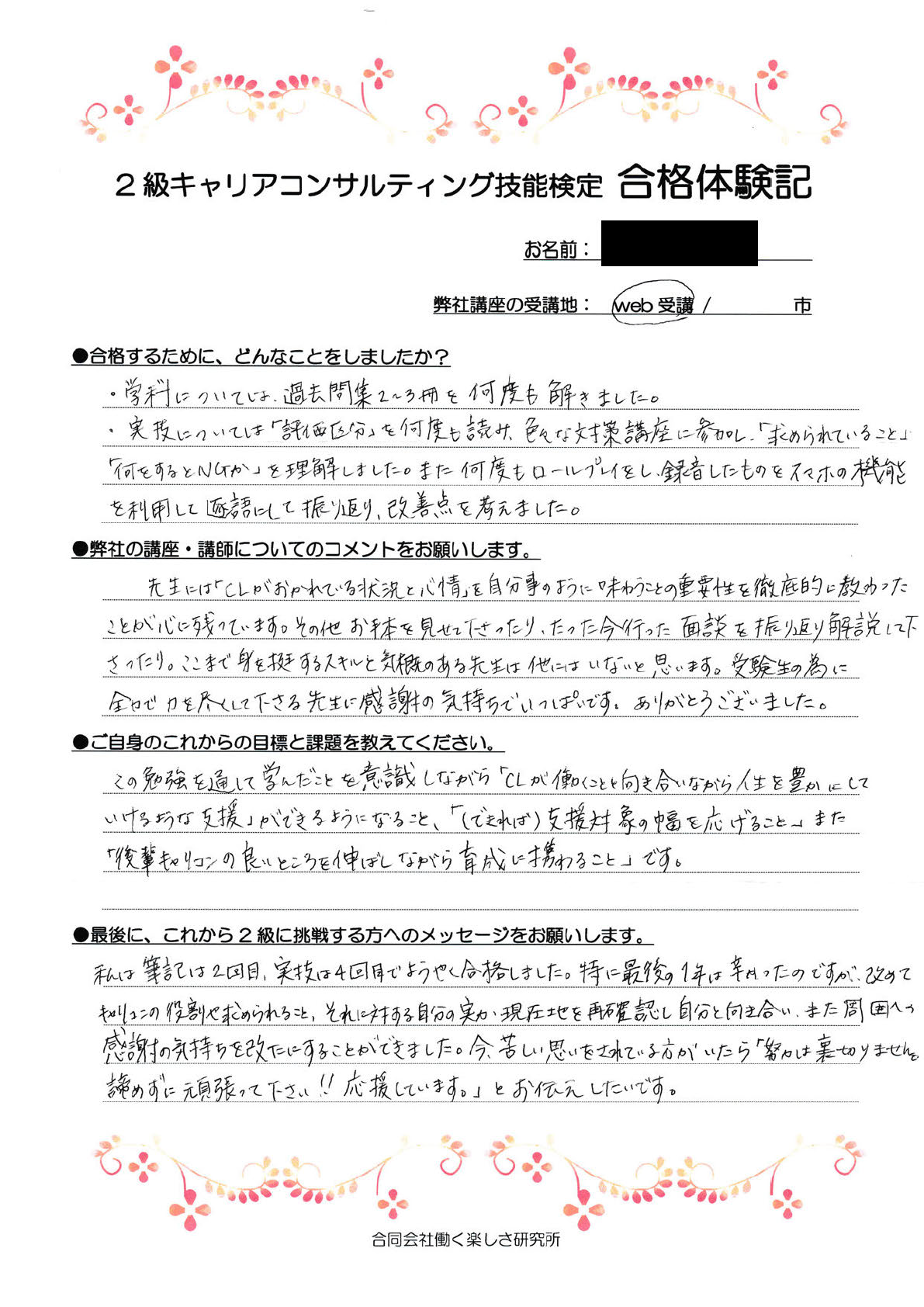 ブログ 2024.04.12 合格体験記最後の1年は辛かったですが、CCの役割や自分の実力を再確認しました。 執筆者 | 合同会社働く楽しさ研究所 東京都・第31回合格 「私は筆記は2回目、実技は4回目でようやく合格しました。特に最後の1年は辛かったのですが、あらためてCCの役割や求められること、それに対する自分の実力・現在地を再確認し自分と向き合い、また周囲への感謝の気持ちを新たにすることができました。今苦しい想いをされている方がいたら『努力は裏切りません。諦めずに頑張ってください!応援しています。』とお伝えしたいです。」 2級CC技能検定対策講座のご案内ページはこちら 一覧へ戻る