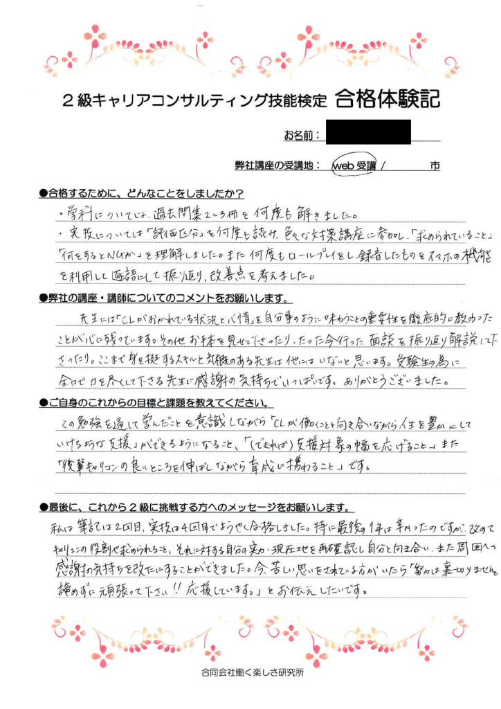 ブログ 2024.04.12 合格体験記最後の1年は辛かったですが、CCの役割や自分の実力を再確認しました。執筆者 | 合同会社働く楽しさ研究所 東京都・第31回合格「私は筆記は2回目、実技は4回目でようやく合格しました。特に最後の1年は辛かったのですが、あらためてCCの役割や求められること、それに対する自分の実力・現在地を再確認し自分と向き合い、また周囲への感謝の気持ちを新たにすることができました。今苦しい想いをされている方がいたら『努力は裏切りません。諦めずに頑張ってください!応援しています。』とお伝えしたいです。」2級CC技能検定対策講座のご案内ページはこちら一覧へ戻る