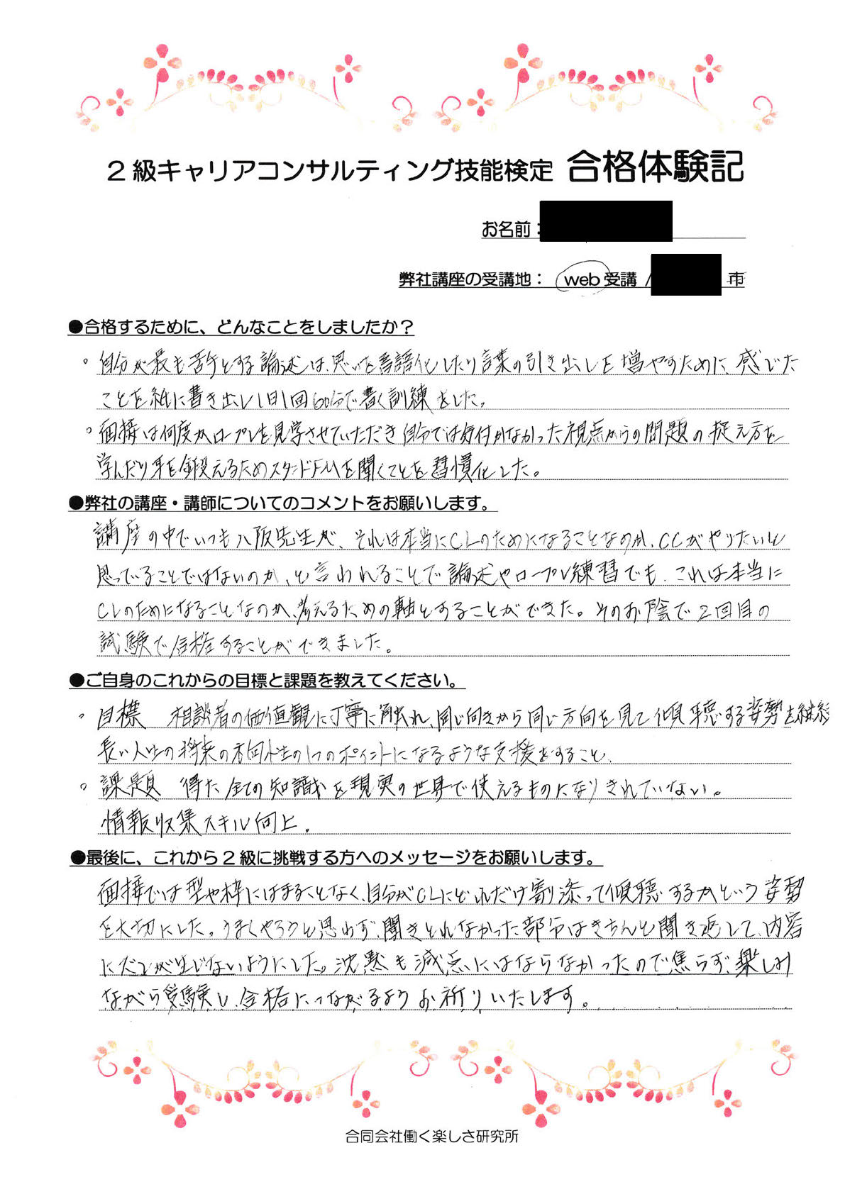 「面接では型や枠にはまることなく、自分がCLにどれだけ寄り添って傾聴するかという姿勢を大切にした。うまくやろうと思わず、聞き取れなかった部分はきちんと聞き返して、内容にズレが生じないようにした。沈黙も原点にはならなかったので、焦らず楽しみながら受検し、合格に繋がるようお祈りいたします。」