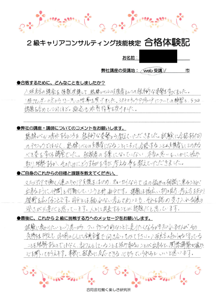 東京都・企業領域・第33回合格熟練レベルの意味するところを、根本的な姿勢から教えていただきました。試験に合格するためのテクニックではなく、熟練レベルの支援者になることによって、合格することと、支援者としてのあるべき姿を学べる講座でした。相談者の言葉になっていない、本当の思いをいかに汲み取り、理解するか。そのためにどうするかを学び考えることを教えていただきました。