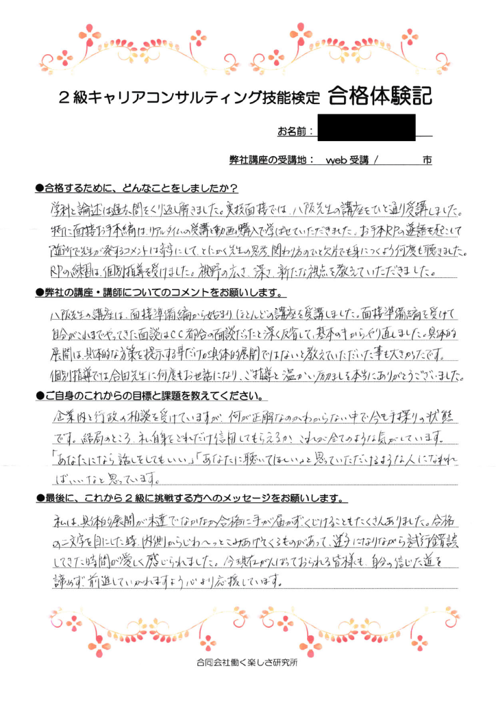 「私は具体的展開が未達でなかなか合格に手が届かず、くじけることもたくさんありました。合格の2文字を目にした時、内側からじわ~っとこみあげてくるものがあって、迷子になりながら試行錯誤をしてきた時間が愛しく感じられました。今現在がんばっておられる皆様も、自分の信じた道を諦めず、前進していかれますように心より応援しています。」